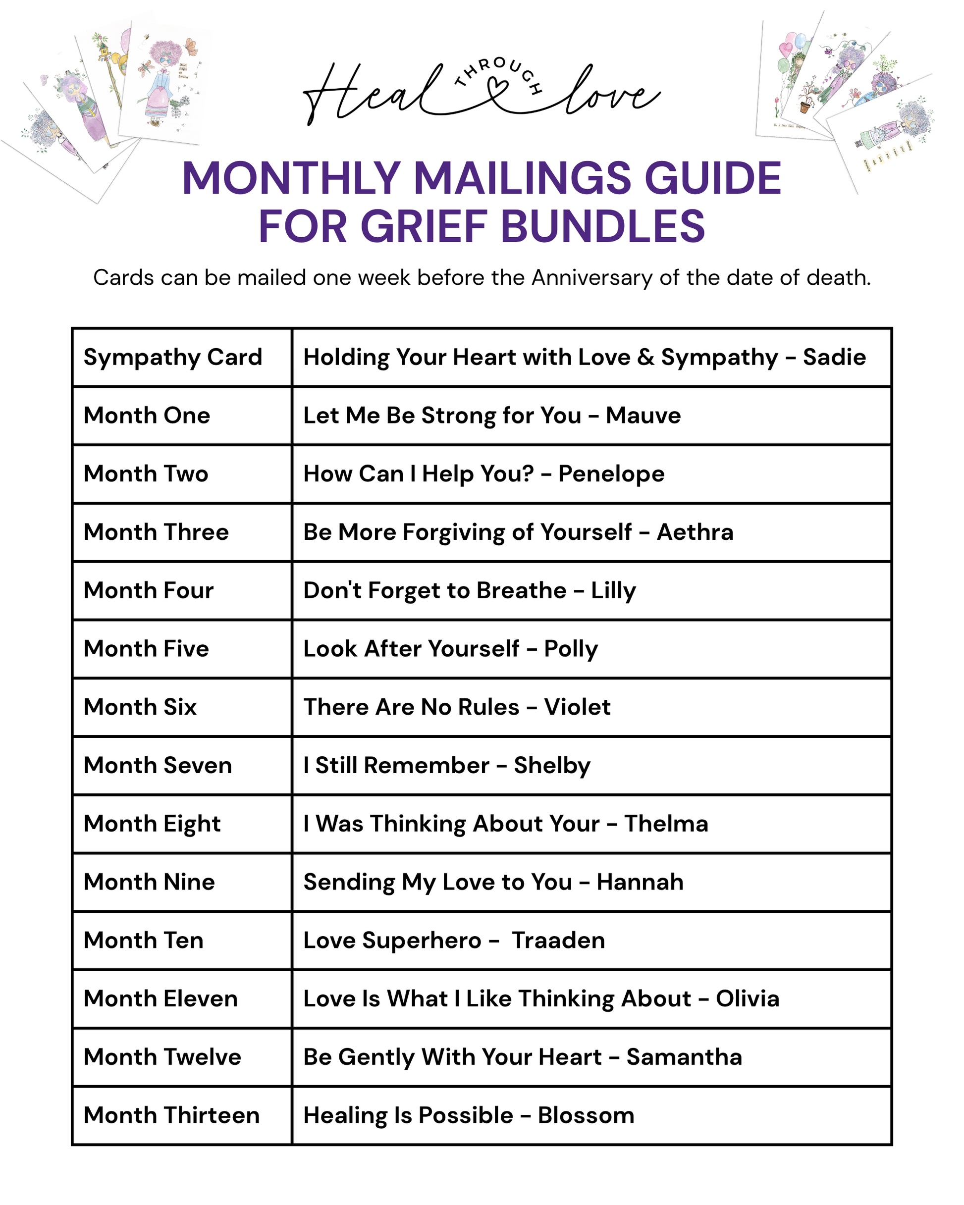 - Initial sympathy card, plus 13 monthly cards offering warmth, remembrance, and love—even in the month after the first anniversary.